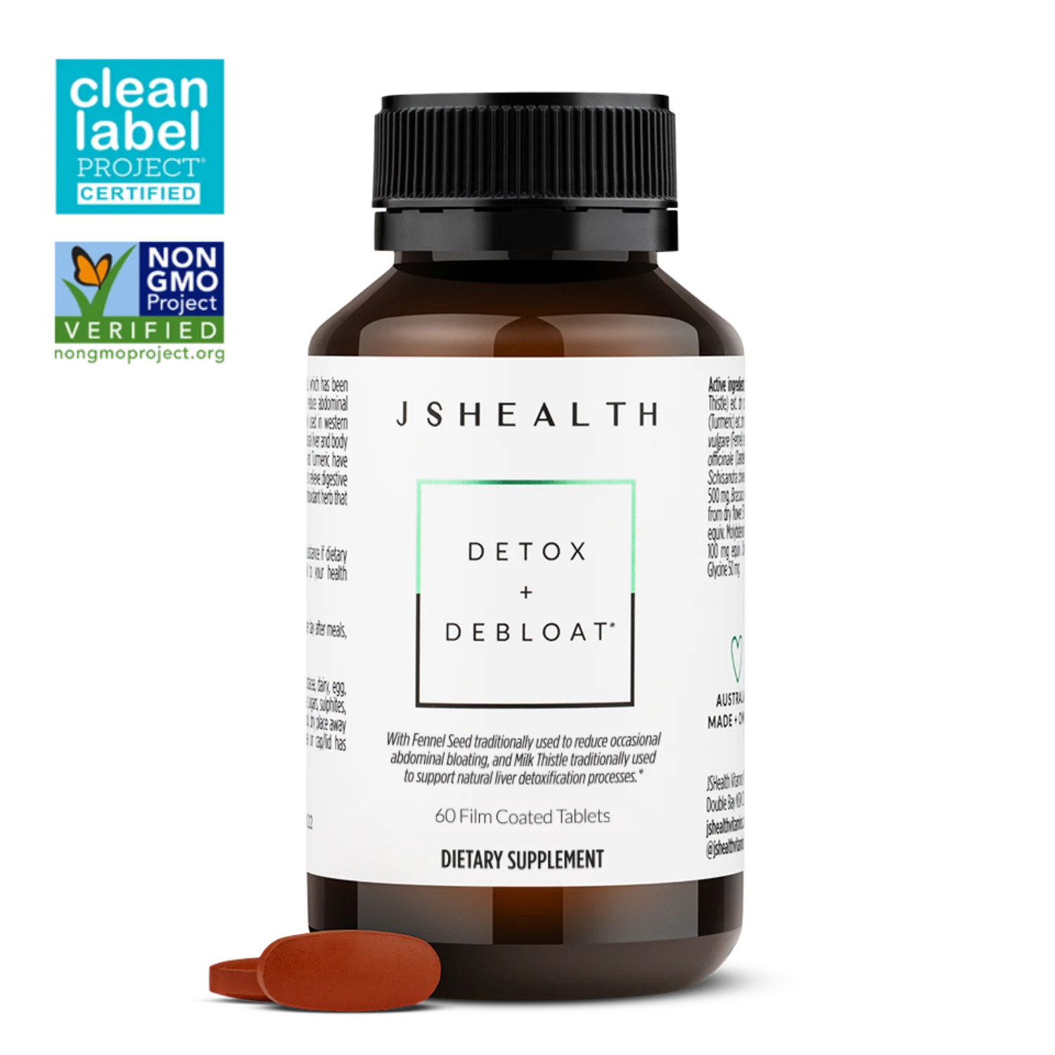 The JSHealth Detox + Debloat formula contains Milk Thistle, Fennel Seed, and Turmeric.